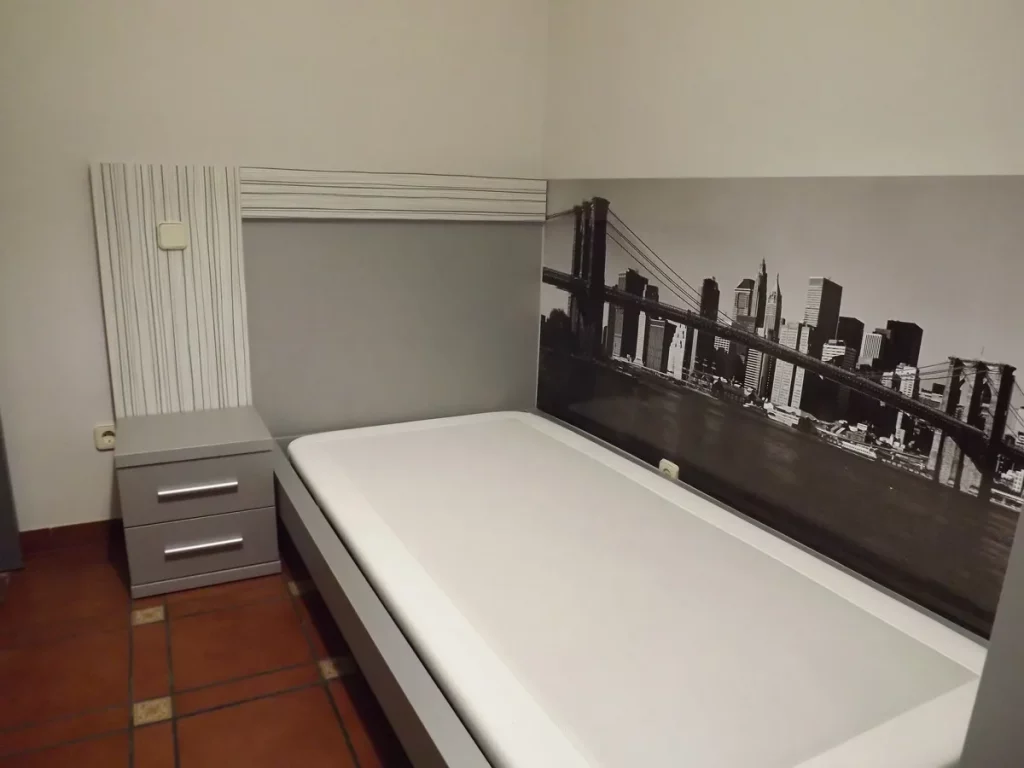 La habitación juvenil cumplía su función, pero su estética había quedado anticuada. Por eso apostamos por renovar por completo la composición, integrando líneas rectas, tonos neutros y una imagen visual que añadiera profundidad a la pared principal.