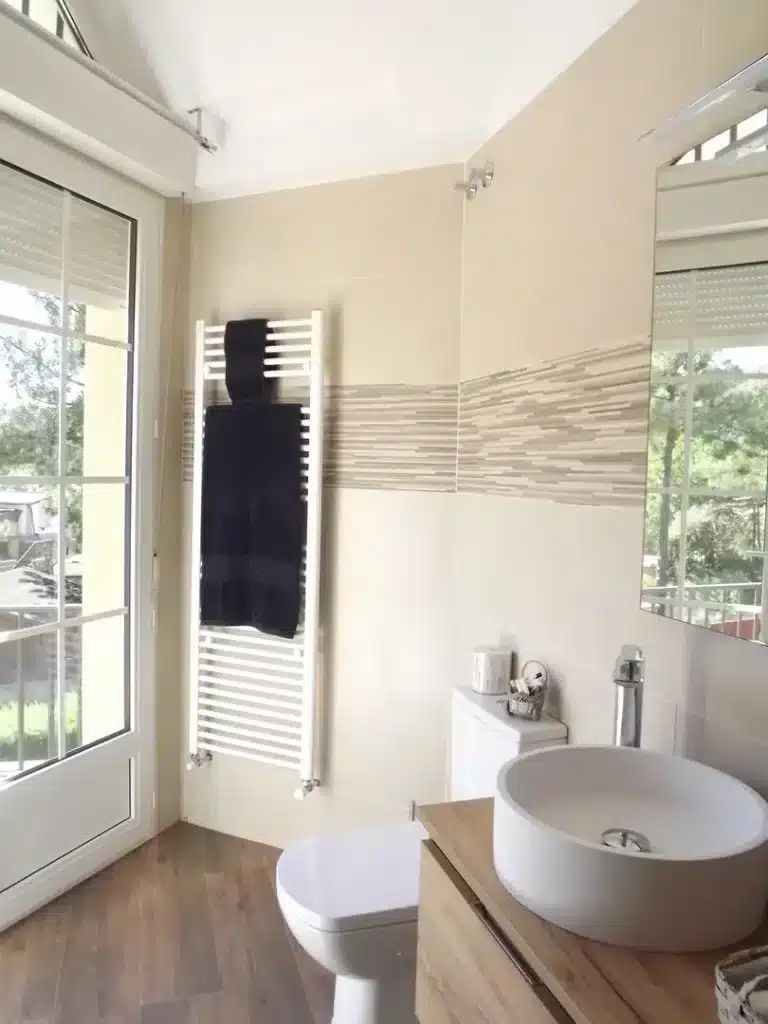 Los rincones serpenteantes del baño exigían una lectura pausada y, precisamente por eso, decidimos aprovechar cada ángulo con soluciones prácticas. La pared que generaba un quiebro poco frecuente se convirtió en el lugar perfecto para ubicar un toallero que, además de mejorar la climatización, sumó presencia estética. Paralelamente, la continuidad entre las zonas lavabo, inodoro y acceso al exterior se reforzó mediante una línea cerámica horizontal que aporta coherencia cromática y equilibrio.