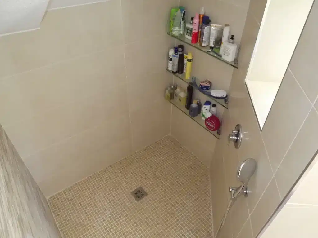 La zona más íntima del baño se diseñó como una ducha de obra donde la luz adquiere una presencia decisiva. La pequeña ventana nos permitió reforzar la serenidad del conjunto, mientras que las baldas integradas ayudaron a ordenar los productos de uso diario sin generar ruido visual. Gracias a esa combinación, el espacio ganó continuidad y una sensación de calma que lo define por completo.